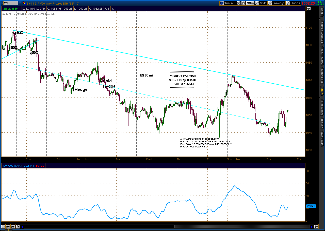 The SPY Oct Calls that were bought Friday for a hedge against the short ES's were sold this morning. Still holding short ES from 1085.00. The Stop & Reverse has now been moved to ES 1085.00 as well. Will continue to hold short as long as prices continue to trade below the down trend line (thick blue line).