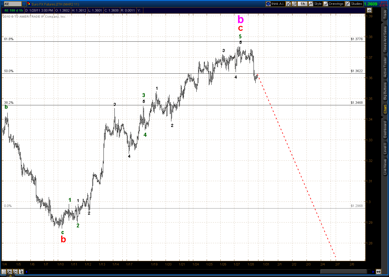 However, the internal count of Minor W c does not yet appear complete although it does look to be in Micro W 3 (black) of Minute W 5 (green) suggesting that a top is nearby. The next fib retracement level of the November sell off is the .618 level at 1.3776. The EUR could well hit it.