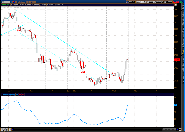 Gold and Silver generated a buy signal on the hourly Trend/Osc last night (1 AM for Gold, 2 AM on Silver) so I went long both metals between 8 and 8:30 this AM. It was a nail biter through the middle of the day, but after lunchtime both trades really started cooking. Hard on my nerves but in the end feels good in the pocketbook. FYI - I do post my trades to this site (just below the header above) as soon as I execute them.