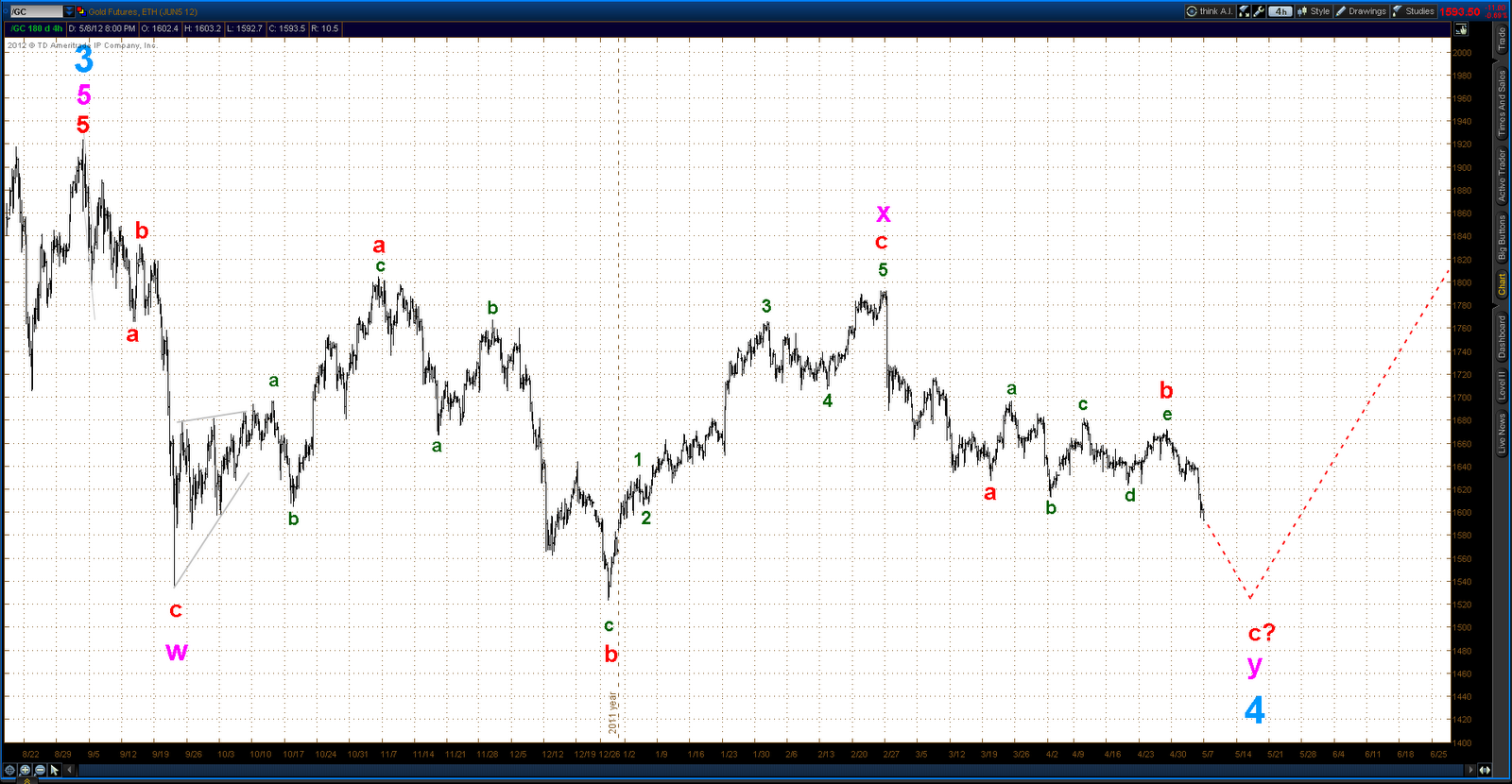 Most wavers that I'm familiar with are in agreement that the highs in the $1920 area of last year marked the top of a 3rd wave of a bull market dating back to the Oct 2008 lows. Since that high gold would be expected to trace out a 4th wave followed by a 5th wave to a top at or above the $1920 highs.