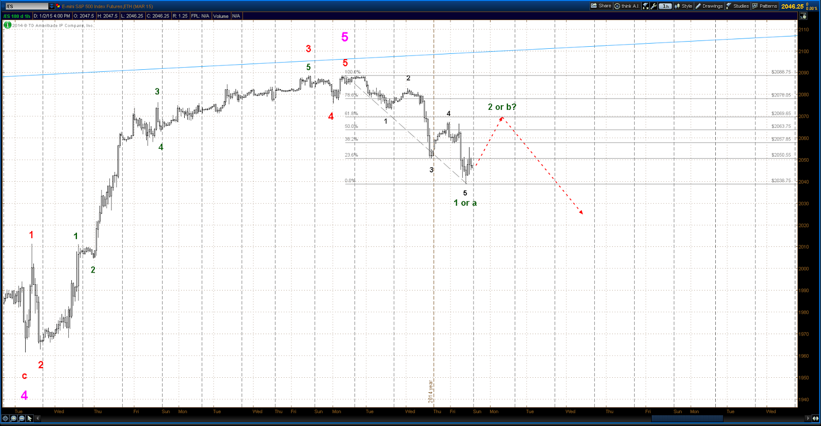 The triangle idea was born out of the difficulty in discerning the EW pattern in the muddy mess that the ES has laid out in the last few weeks.  The cash (SPX) is somewhat cleaner but still difficult.  Especially troublesome is the rally of the week before last.  Alternate #1 assumes this rally to be the "c" wave of a flat, in which case it needs to be a 5 wave structure.  As can be seen, I can make a 5 wave count out of the structure if I stand on my head while twiddling my thumbs and whistling Dixie.  But the fact is that it counts much better as a 3 wave move as in Alternate #2.  One thing for sure:  it's very much a corrective type move, and the market did in fact embark on a week of bear action after it's conclusion.